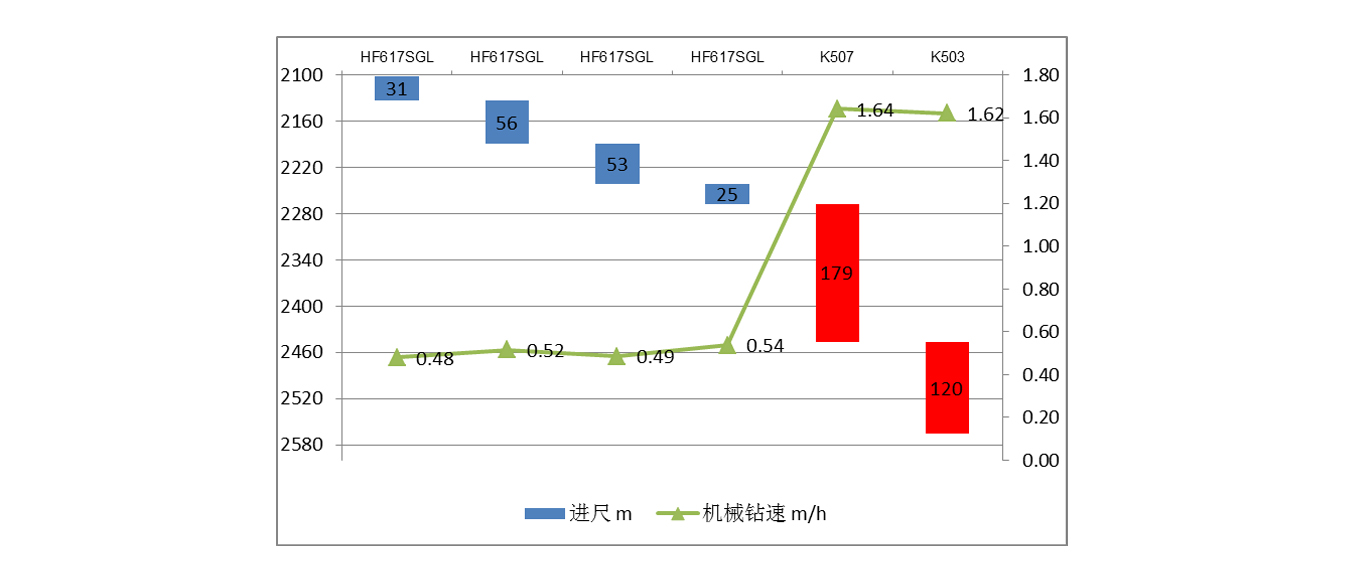 通过百勤石油提供的精湛的技术服务和优质的设备配套,顺利实现了毛坝501-1H井的涡轮钻井作业,本井此次涡轮配孕镶金刚石钻头钻井施工共进行2趟钻,工具钻进总进尺299m,录井纯钻时间183h,平均机械钻速1.63m/h,是牙轮钻头平均机械钻速0.5m/h的3.26倍;单只钻头平均进尺149.19m,是牙轮钻头单只平均进尺41.25m的约3.62倍。