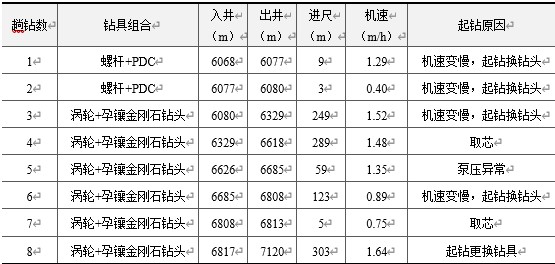 在6068 - 7120米井段,某探1井前期采用两趟螺杆+ PDC 钻头钻进方式,平均单趟进尺仅为6米,平均钻速为0.84 米/小时。而在采用百勤全金属高速涡轮 + 孕镶金刚石钻头组合技术后,正常起钻5趟,平均单趟进尺大幅提升至204米,平均钻速达1.37米/小时,不仅顺利达到预期指标,而且提速效果十分突出。